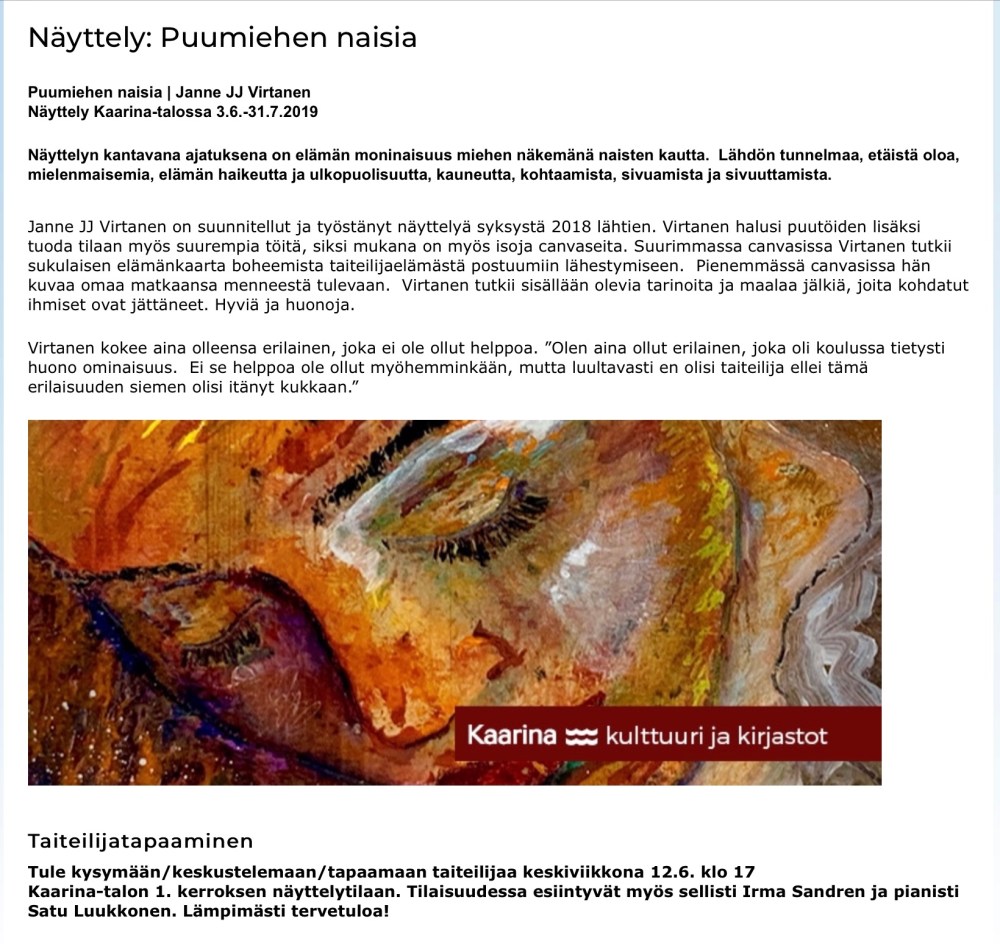 woodart My art exhibition 3.6.-31.7. Kirjoittanut jannejvirtanen on 2 kesäkuun, 2019 Jako Jaa Facebookissa(Avautuu uudessa ikkunassa) Facebook Tykkää Lataa... Aiheeseen liittyy Julkaissut jannejvirtanen I’m a full time artist 👨🎨 from Finland 🇫🇮 . As a carpenter I use much wood too. Näytä kaikki artikkelit kirjoittajalta jannejvirtanen